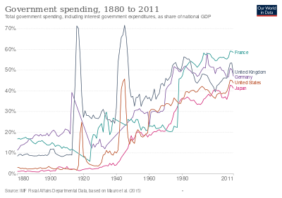 The World War I caused a global growth of the public expenditure share in GDP. In United Kingdom, Germany, Italy and France, which were affected a lot by the war, the share of public expenditure even exceeded 25 percent. In interwar period the average share of the public expenditure was still slightly increasing. The United States increased its public expenditure with the New Deal. Other governments also increased public expenditure to create more employment. The increase was accelerated by World War II anticipation in the second part of the 30s among European countries. In 1937 the amount of average public expenditure share was between 22 and 23 percent, twice as much as before World War I. However, it is fair to mention that part of this increase of public expenditure share was caused by GDP fall. Most of industrialized countries had its GDP over 15 percent before the World War II. Only Australia, Norway and Spain had less than 15 percent of GDP.[5]