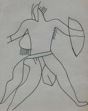 The second, particular to the Djerat wadi, would be composed of slender human figurations, mainly masculine ithyphallic, with a European profile, wearing feathers and a pointed beard. "Several of them are busy practicing the sexual act," notes Lhote.[14] Several archers "shoot each other" or chase the mouflon.