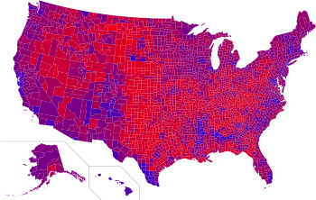 Feelings of cultural and political polarization between red and blue states, which have gained increased media attention since the 2004 election, have resulted in increased mutual feelings of alienation and enmity.[29] The polarization has been present for only four close elections (2000, 2004, 2016, and 2020). One trend that has been true for several election cycles is that states that vote Republican tend to be more rural and more sparsely populated (thus having fewer electoral votes) than states that vote Democratic. Polarization is more evident on a county scale with the growing percentage of the U.S. electorate living in "landslide counties", counties where the popular vote margin between the Democratic and Republican candidate is 20 percentage points or greater.[30][31][32]