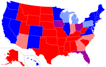 Starting with the 2000 United States presidential election, the terms "red state" and "blue state" have referred to U.S. states whose voters vote predominantly for one party — the Republican Party in red states and the Democratic Party in blue states — in presidential and other statewide elections.[1] By contrast, states where the vote fluctuates between the Democratic and Republican candidates are known as "swing states" or "purple states". Examining patterns within states reveals that the reversal of the two parties' geographic bases has happened at the state level, but it is more complicated locally, with urban-rural divides associated with many of the largest changes.[2]