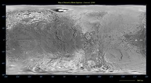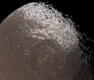The bright regions of Iapetus. Roncevaux Terra is at the top (north); Saragossa Terra with its prominent crater Engelier is at bottom