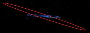 Side view of Iapetus's orbit (red) compared to the other large moons, showing its unusually high inclination