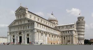 The Leaning Tower of Pisa and the Duomo di Pisa, in the Piazza dei Miracoli. The Piazza is a UNESCO World Heritage Site,[18] and both buildings are examples of Romanesque architecture.[19]