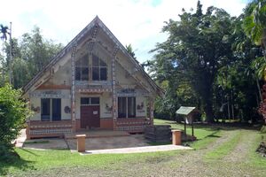 The name for the islands in the Palauan language, Belau, derives from the Palauan word for "village", beluu (thus ultimately from Proto-Austronesian *banua),[14] or from aibebelau ("indirect replies"), relating to a creation myth.[15] The name "Palau" originated in the Spanish Los Palaos, eventually entering English via the German Palau. An archaic name for the islands in English was the "Pelew Islands".[16] The name of the country "Palau" is most likely not derived from the Malay word "Pulau," despite the similarity in its word form. In Malay, "pulau" means "island," which is also a geographical characteristic of Palau as an archipelago in the Pacific Ocean.