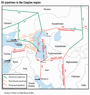 ولأن أذربيجان وتركمنستان وكازخستان دولاً محصورة برِّيًّا، وليس لها موانئ مُطِلَّة على البحار المفتوحة، كما هو الحال مع إيران، تسعى كل دولة بكل ما تملك لإغراء الدول المستهلكة والقريبة من حدودها، والتي تتمتع بشواطئ مفتوحة على العالم، لكي تقوم بنقل غازاتها وبيعها للسوق العالمية.