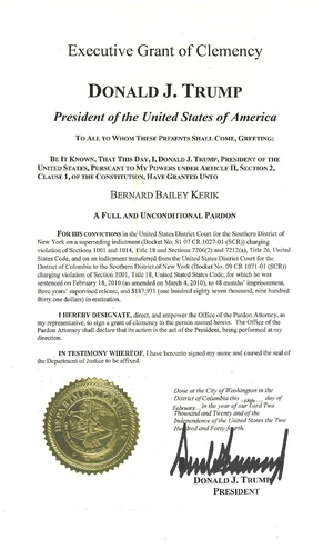 - ^ أ ب Shear, Michael D.; Haberman, Maggie (February 18, 2020). "Trump Grants Clemency to Blagojevich, Milken and Kerik". The New York Times.