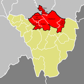 The wards and boundaries for the Bromley and Chislehurst Parliament constituency (red) as first used in the 2010 general election, shown within the London Borough of Bromley (yellow)