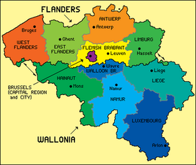 بلجيكا مُقسمة بين الجاليات الثلاث الفلمنك، الوالون والناطقين بالألمانية إلى ثلاث أقاليم: فلاندرز، والونيا و بروكسل. العاصمة بروكسل هي أكبر المدن (959,318)، تليها أنتويرپ (445,570)، غنت (224,685)، شارلروا (200,233) و ليج (184,550).
