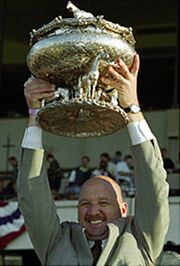 Despite the fact that the Belmont Stakes is the oldest of the Triple Crown races, its traditions have been more subject to change. Until 1996, the post parade song was "The Sidewalks of New York". From 1997 to 2009, the song was changed to a recording by Frank Sinatra of the "Theme from New York, New York" in an attempt to appeal to younger fans.[39] In 2010, the song was changed to Jay-Z's "Empire State of Mind" sung by Jasmine V[40] before reverting to "Theme from New York, New York" from 2011[41] through the present. This tradition is similar to the singing of the state song at the post parades of the first two Triple Crown races: "My Old Kentucky Home" at the Kentucky Derby and "Maryland, My Maryland" at the Preakness Stakes.[8] The change of song gave rise to "the myth of Mamie O'Rourke", a reference to a character in the lyrics of "The Sidewalks of New York." Before American Pharoah won the Triple Crown in 2015, some claimed that changing the official Belmont song "cursed" the Triple Crown and was why no horse had won since Affirmed in 1978. Others note that there was no Triple Crown winner between 1979 and 1996, even though "Sidewalks" was still played.[42]