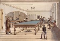 Illustration of a three-ball pocket billiards game in early 19th century Tübingen, ألمانيا, using a table much longer than the modern type.