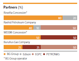 بدأ الانتاج بمنطقة امتياز رشيد في 2001، ويورد الانتاج للسوق المحلي المصري. في 2004، استحوذت بي جي على 40% إضافية في منطقة الامتياز.
