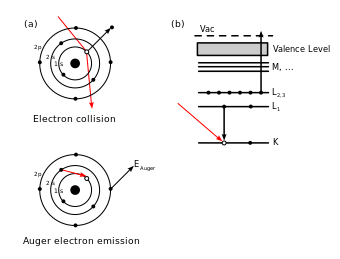 شكل 1. منظران لعملية أوجيه. (a) توضح تتابعياً الخطوات في عملية إزالة إثارة أوجيه. يخلق الإلكترون الساقط فجوة في قلبة المستوى 1s. إلكترون من المستوى 2s يملأ فجوة 1s hole وطاقة الانتقال تنفصل إلى إلكترون 2p الذي ينطلق. وبذلك فالحالة الذرية النهائية يكون فيها فجوتان، واحدة في المدار 2s والأخرى في المدار 2p. (b) تشرح نفس العملية باستخدام الترميز المطيافي، .