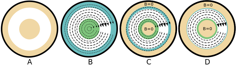 حيث يدل ro على نصف قطر السلك الناقل، ويدل r على بعد النقطة المعتبرة عن محور الناقل، ويدل Jo Eo على الحقل الكهربائي وكثافة التيار عند سطح الناقل. أما σ فيدل على عمق النفوذ أو ثخن قشرة الناقل ويساوي: