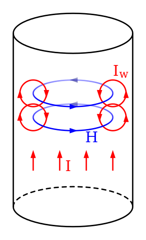 ففي حالة ناقل أسطواني مستقيم يمر فيه تيار متناوب، يولد هذا التيار في الناقل حقلاً تحريضياً مغنطيسياً ، ويظهر في كل نقطة حقل كهربائي تحريضي محرِّك فإذا كان الحقل الكهرالدي، فإن الحقل الكهربائي الكلي يساوي وترتبط كثافة التيار بالحقل بالعلاقة حيث تمثل σ ناقلية (موصلية) conductivity مادة الناقل. وينتج أن: