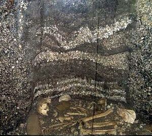 The main archaeological sites on the coast are the middens.[1][32][33][34] Usually, skeletons of ancient Americans, lithic pieces, food remains, are found near them. A large part of the Brazilian middens are covered by the sea, due to the climatic changes that occurred during the late Pleistocene and Holocene. They exist almost everywhere along the Brazilian coast. At the time of their discovery, in the 19th century, they were compared to similar structures in Scandinavia. Middens are associated with the "Itaipu tradition". The people who inhabited the coast are usually defined as semi-nomadic fishermen.[1][35]