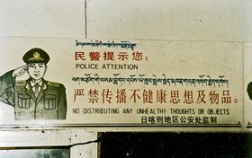"Police Attention: No distributing any unhealthy thoughts or objects." A trilingual (Tibetan – Chinese – English) sign above the entrance to a small cafe in Nyalam, Tibet, 1993.