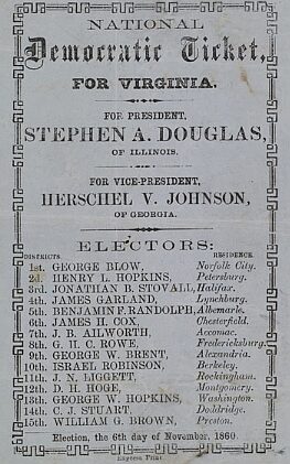 In 1860, the Democrats split over the choice of a successor to President Buchanan along Northern and Southern lines.[43] Some Southern Democratic delegates followed the lead of the Fire-Eaters by walking out of the Democratic National Convention at Charleston's Institute Hall in April 1860. They were later joined by those who, once again led by the Fire-Eaters, left the Baltimore Convention the following June when the convention rejected a resolution supporting extending slavery into territories whose voters did not want it. The Southern Democrats, also referred to as Seceders, nominated John C. Breckinridge of Kentucky, the pro-slavery incumbent vice president, for president and General Joseph Lane, former governor of Oregon, for vice president.[44] The Northern Democrats proceeded to nominate Douglas of Illinois for president and former governor of Georgia Herschel Vespasian Johnson for vice president, while some southern Democrats joined the Constitutional Union Party, backing former Senator John Bell of Tennessee for president and politician Edward Everett of Massachusetts for vice president. This fracturing of the Democratic Party left it powerless.