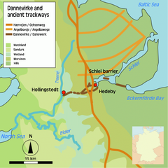 The oldest parts of the defensive works of Danevirke near Hedeby at least date from the summer of 755 and were expanded with large works in the 10th century. The size and number of troops needed to man it indicates a quite powerful ruler in the area, which might be consistent with the kings of the Frankish sources. In 815 AD, Emperor Louis the Pious attacked Jutland apparently in support of a contender to the throne, perhaps Harald Klak, but was turned back by the sons of Godfred, who most likely were the sons of the above-mentioned Godfred. At the same time St. Ansgar travelled to Hedeby and started the Catholic Christianisation of Scandinavia.