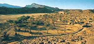 [In] the highlands of the central Sahara beyond the Libyan desert,... in the great massifs of the Tibesti and the Hoggar, the mountaintops, today bare rock, were covered at this period with forests of oak and walnut, lime, alder and elm. The lower slopes, together with those of the supporting bastions — the Tassili and the Acacus to the north, Ennedi and Air to the south — carried olive, juniper and Aleppo pine. In the valleys, perennially flowing rivers teemed with fish and were bordered by seed-bearing grasslands.[1]