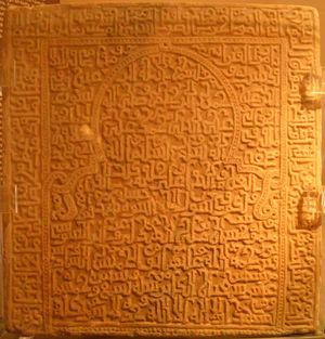 بسم الله الرحمن الرحيم قل هو الله أحد الله الصمد لم يلد ولم يولد ولم (... توفي...يوم الأربعا ودخل قبره يوم الخميس من العشر الأو(... الخلق والأمر تبارك الله رب العالمين ادعو ربكم تضرعا وخيفة إنه لا يحب المع(...) محمد وآله وسلم تسليما إن ربكم الله ...)م ثم استوى على العرش يغشي الليل النهار يطلبه حثيثا والشمس والقمر والنجوم مسخرات بأمره إلا له(؟)