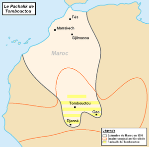 في النهاية انهارت إمبراطورية صنغاي تحت ضغط من الأسرة السعدية المغربية. وكانت معركة تونديبي التي وقعت في 13 مارس 1591 هي نقطة التحول. في أعقاب المعركة سيطرت المغرب على گو، تنبكتو، جيني (جنى حالياً)، وطرق التجارة المتعلقة بصعوبة كبيرة حتى نهاية القرن السابع عشر تقريباً.