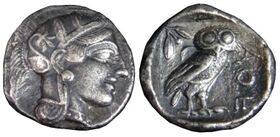 The Athenian tetradrachm was widely used in transactions throughout the ancient Greek world, including in cities politically unfriendly to Athens.[2] Athens had silver mines in state ownership, which provided the bullion. Most well known were the silver mines of Laurium in Athenian countryside.[3] The Athenian tetradrachm was stamped with the head of Athena on the obverse, and on the reverse the image of the owl of Athena, the iconographic symbol of the Athenian polis, with a sprig of olive and a crescent for the moon. According to Philochorus, it was known as glaux (γλαύξ, 'little owl')[4] throughout the ancient world[5] and "owl" in present-day English language numismatics.[6] The design was kept essentially unchanged for over two centuries, by which time it had become stylistically archaic. To differentiate their currency from the rival coinage of Aegina using the Aeginetic stater of about 12.3 grams, Athens minted its tetradrachm based on the "Attic" standard of 4.3 grams per drachma. The vast number of "owls-tetradrachms" available those days mainly from the silver mines of Laurium financed the several achievements of Athens, such as the reconstruction of the Acropolis and building the Parthenon, as well as many wars, including the Peloponnesian War.