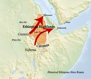 Eunuchs, female concubines and male laborers were the occupations of slaves sent from Ethiopia to Jidda and other parts of Hejaz.[10] The southwest and southern parts of Ethiopia supplied most of the girls being exported by Ethiopian slave traders to India and Arabia.[11] Female and male slaves from Ethiopia made up the main supply of slaves to India and the Middle East.[12]