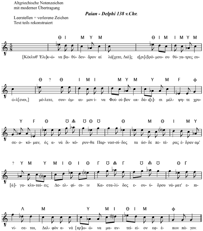 "Athenaios paean" (PDF) (draft). 7 May 2017. - Landels, John Gray (1999). Music in Ancient Greece and Rome. Routledge. ISBN 0-203-04284-0.