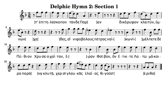 Pöhlmann and West[17] divide the hymn up into ten short sections, with frequent changes of key. As in the First Delphic Hymn, the song opens by calling on the Muses to come to Delphi to join in the song in honour of Apollo: