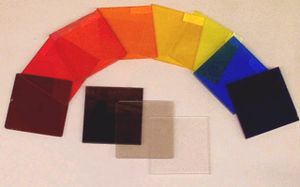 وتسمى أحياناً المرشحات اللونية، وهي أولى المرشحات التي استخدمت في التصوير الضوئي، وتعتمد على الامتصاص[ر] الانتقائي لبعض الألوان أو التواترات والسماح لألوان أخرى بالمرور دون امتصاص يذكر. كانت تصنع على شكل صفائح زجاجية ملونة، وذلك بإضافة بعض الشوائب الخاصة إلى الزجاج العادي. ومازالت تصنع الآن بهذا الشكل وأضيف لها مرشحات لدائنية مصبوغة. تصنع عادة في ثلاثة ألوان رئيسية: أحمر وأخضر وأزرق، تمكننا من التحكم في شدة الضوء النافذ من كل منها لنحصل على الألوان المرغوبة سواء للتصوير أو الطباعة أو الإسقاط الضوئي. وتفيد أيضاً في تصحيح صورة ما وألوانها نتيجة اختلاف حساسية مادة غشاء لوح التصوير للألوان المختلفة فتغير من توزع شدة إضاءة الجسم الأصلية، فنقوم بتصنيع مرشح مناسب يعيد الألوان إلى طبيعتها الأصلية نتيجة التحكم في توزع شدتها من جديد. ويقوم المرشح بتوهين شدات الألوان كلها بصورة متساوية، فيسمى عندئذ بالمرشح الحيادي Neutral filters، نحتاج هذا النوع من المرشحات عند ضرورة تخفيض شدة الإضاءة إلى المستوى الذي تتحمله العين مثلاً. ويصنع نوع منها للوقاية من الأشعة الحرارية التي تقع عادة في مجال ما تحت الأحمر أو للوقاية من الأشعة فوق البنفسجية، فتسمى تبعاً لذلك مرشحات باردة ومرشحات حارة.