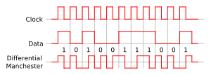 - Manchester code (also variants Differential Manchester & Biphase mark code)