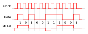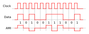 An example of coding a binary signal using rectangular pulse amplitude modulation with polar non-return-to-zero code An example of Bipolar encoding, or AMI. Encoding of 11011000100 in Manchester encoding An example of Differential Manchester encoding An example of Biphase mark code An example of MLT-3 encoding. |
