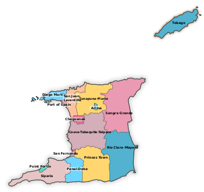 جمهورية ترينيداد وتوباغو (بالإنجليزية: Republic of Trinidad and Tobago) هي دولة تقع في جنوب البحر الكاريبي، على بعد 11 كيلومتراً من فينزويلا. تعتبر ترينيداد وتوباغو أرخبيل مكون من جزيرتين رئيسيتين هما ترينيداد، أكبر جزر ترينيداد وتوباغو، وتوباغو، بالإضافة إلى 21 جزيرة صغيرة أخرى. مساحتها 5128 كم2 وعدد سكانها 1262366 (عام 2000). اللغة الرسمية فيها هي اللغة الإنجليزية. it is situated 11 كيلومتر (6 ميل بحري) northeast off the coast of Venezuela, 130 كيلومتر (70 ميل بحري) south of Grenada, and west of Barbados.[11] [12][13] The capital is Port of Spain, while its largest and most populous municipality is Chaguanas. Despite its proximity to South America, Trinidad and Tobago is generally considered to be part of the West Indies.