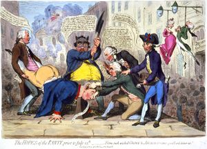 In The Hopes of the Party (1791), Gillray caricatured Fox with an axe about to strike off the head of George III, in imitation of the French Revolution.
