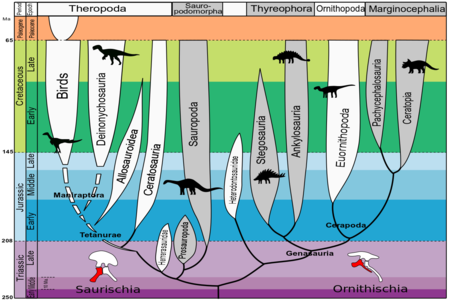 - ^ Sereno PC (1999). "The evolution of dinosaurs". Science. 284 (5423): 2137–2147. doi:10.1126/science.284.5423.2137. PMID 10381873.