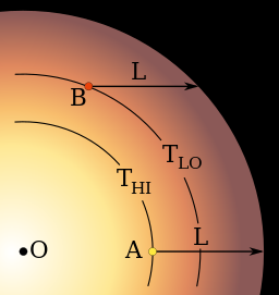 In the figure on the right, as long as the observer at point P is outside the stellar atmosphere, the intensity seen in the direction θ will be a function only of the angle of incidence ψ. This is most conveniently approximated as a polynomial in cos(ψ)