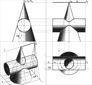 التقاطع بين المخاريط يعتبر في الهندسة الوصفية واحد من حالات التقاطع بين الأسطح المسطرة [1] . وبما أن الأسطوانة هي حالة استثنائية للمخروط، فيمكن سرد حالات التقاطع كما يلي :