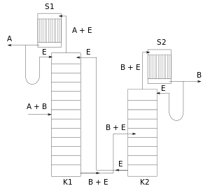 ومن المهم اختيار المذيب الذي يساعد على أداء عملية الاستخلاص . فلا بد للمذيب أن يغير التطايرية النسبية بقدر كبير لتسهيل عملية الفصل . ويدخل هنا في الاعتبار كمية المذيب الازمة ،وتمنها ، وسهولة الحصول عليها . كما لابد وأن يسهل استخلاص المذيب بعد ذلك من السائل الثاني ، وأن لا يتفاعل مع مكونات المخلوط ، ولا يعمل على تآكل الجهاز . ومن الأمثلة الشائعة ، مثال فصل المخلوط الأزيوتروبي المكون من البنزين و سيكلوهيكسين ، حيث يقوم أنيلين بمقام المذيب المناسب.