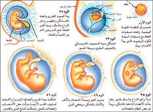 - لذراعان والساقان. تظهر كبراعم نسيجية خلال الأسبوع الخامس من الحمل. تبدأ الذراعان بالنمو قبل الساقين بعدة أيام. ويصبح تمييز أصابع اليدين والقدمين ممكناً في الأسبوع السادس، وتتشكل عندما تموت خلايا معينة وتترك فراغات في النسيج المتبقي.
