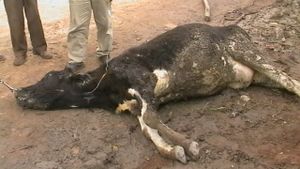 بقرة كانت ترعى في مرعى سريع النمو، مصابة بتكزز في الرقية، مما يقترح تكزز الحشائش