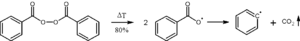 پروكسيد الدايبنزويل يُستخدم كبادئ لتفاعلات الجذور. بمساهمة ضئيلة في التكسر المتماثل، تنطلق الحرارة في مرحلتين.