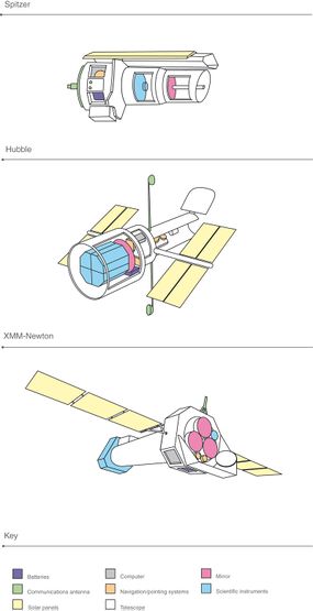 أطلق عدد من التلسكوبات أو المراصد الفضائية الى الفضاء وأشهرها تلسكوب الفضاء هابل الذى أطلق من مكوك فضائى سنة 1990م ووضع في مدار حول الكرة الأرضية على ارتفاع نحو 600 كيلو متر .