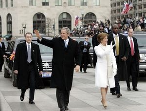 President George W. Bush and First Lady Laura Bush lead the inaugural parade down Pennsylvania Avenue to the White House, 2005