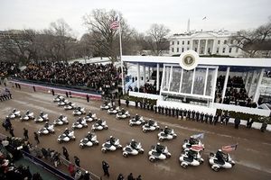 The Inaugural Parade on Pennsylvania Avenue passes the presidential reviewing stand in front of the White House in January 2005.