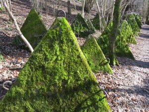 The distinct pyramidal shape of the bar lent its name to the Toblerone line, a series of anti-tank emplacements prevalent in Switzerland's border areas.[21][22]