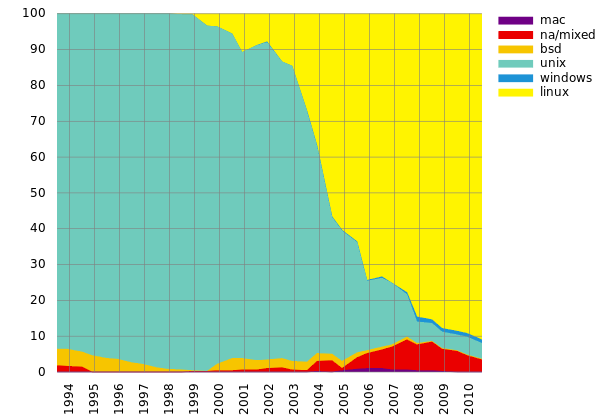 جميع الحواسيب الفائقة الأسرع منذ الحاسوب الفائق محاكي الأرض استخدمت أنظمة تشغيل تعتمد على لينكس. اعتباراً من نوفمبر 2017، كانت جميع الحواسيب الفائقة تستخدم نظام تشغيل يعتمد على لينكس كارنل.[16][17]