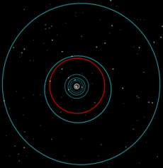 Titan's orbit (highlighted in red) among the other large inner moons of Saturn. The moons outside its orbit are (l-r) Iapetus and Hyperion; those inside are Dione, Tethys, Enceladus and Mimas.