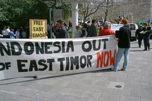 وفي عام 1975م، انسحبت البرتغال من تيمور الشرقية، واندلعت حرب أهلية خاطفة. وفي نوفمبر من العام نفسه أعلن أحد أطراف النزاع، الجهة الثورية لتيمور الشرقية المستقلة، استقلال تيمور الشرقية. وفي ديسمبر ضمت إندونيسيا الجزء الشرقي من الجزيرة لسيادتها. وفي يوليو 1976م، جعلت إندونيسيا من تيمور الشرقية مقاطعتها السابعة والعشرين إلا أن الأمم المتحدة لم تعترف بالسيادة الإندونيسية على الإقليم.
