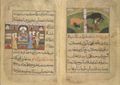 The Battle at Lanka, Ramayana by Sahibdin. It depicts the monkey army of the protagonist Rama (top left, blue figure) fighting Ravana—the demon-king of the Lanka—to save Rama's kidnapped wife, Sita. The painting depicts multiple events in the battle against the three-headed demon general Trisiras, in the bottom left. Trisiras is beheaded by Hanuman, the monkey-companion of Rama.