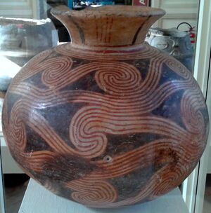 Travelers in the 1800s noted both the presence of mounds and the beauty of the ceramics found inside them or exposed on their sides.[9] Museums in Europe and the United States began to collect some of the larger and more beautiful pieces, the largest of which are funerary urns. Buried in house floors constructed on the tops of the mounds, the elaborately decorated urns contain the remains of significant individuals. When the individuals died, the flesh was cleared from their bones and the remains were placed in the urns, which were then topped with a bowl or platter.[10]